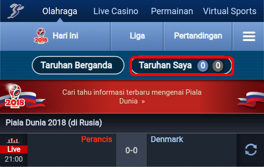 Sebagai contoh pilihan total booking handicap babak pertama ada di dalam kotak merah, anda ingin memilih pilihan total booking handicap babak pertama Denmark -0-0.5 yang bertulis 1.28 seperti pada lingkaran merah untuk melakukan taruhan. -0.-0.5 atau juga -1/4 yang dimaksud adalah Denmark memberikam voor 1/4 kartu lebih banyak kepada Perancis. Untuk memenangkan taruhan Denmark harus memiliki jumlah kartu minimal 1 lebih banyak dari perancis. Setelah anda menekan taruhan anda maka akan muncul gambar seperti dibawah ini.